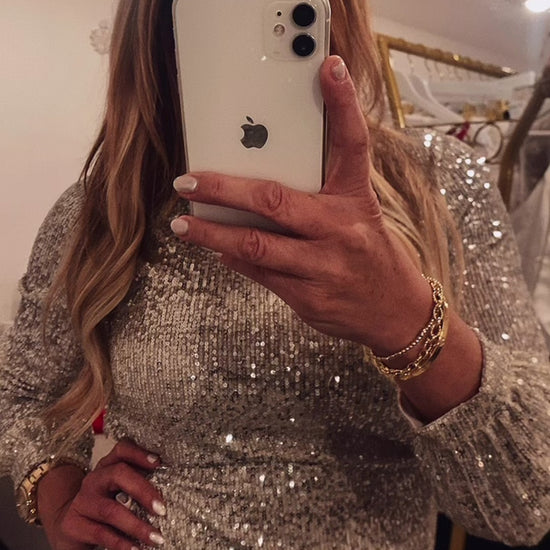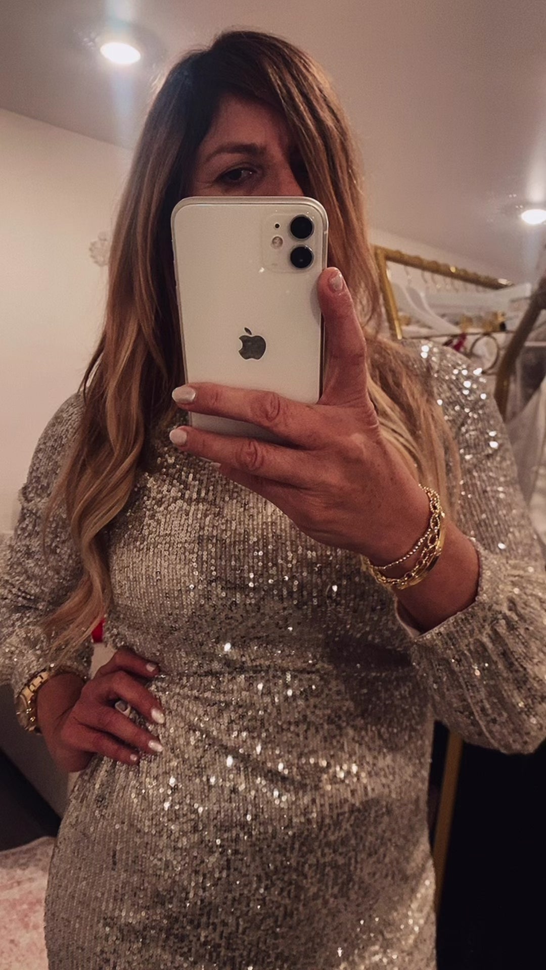 The silver nude chic dress for this Winter holiday is here! It is comfty and perfect to wear it with opaque stockings and favorite heels. Model is wearing a size Large.