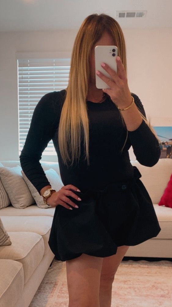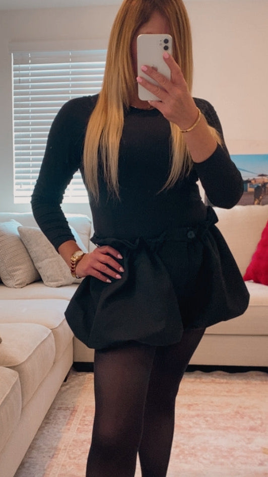 These chic bubble shorts are the cutest with the ruffle detail at the waist and comfortable ones to wear with your black stockings. Pair with your black pumps or black botas. Model is wearing a size Medium.